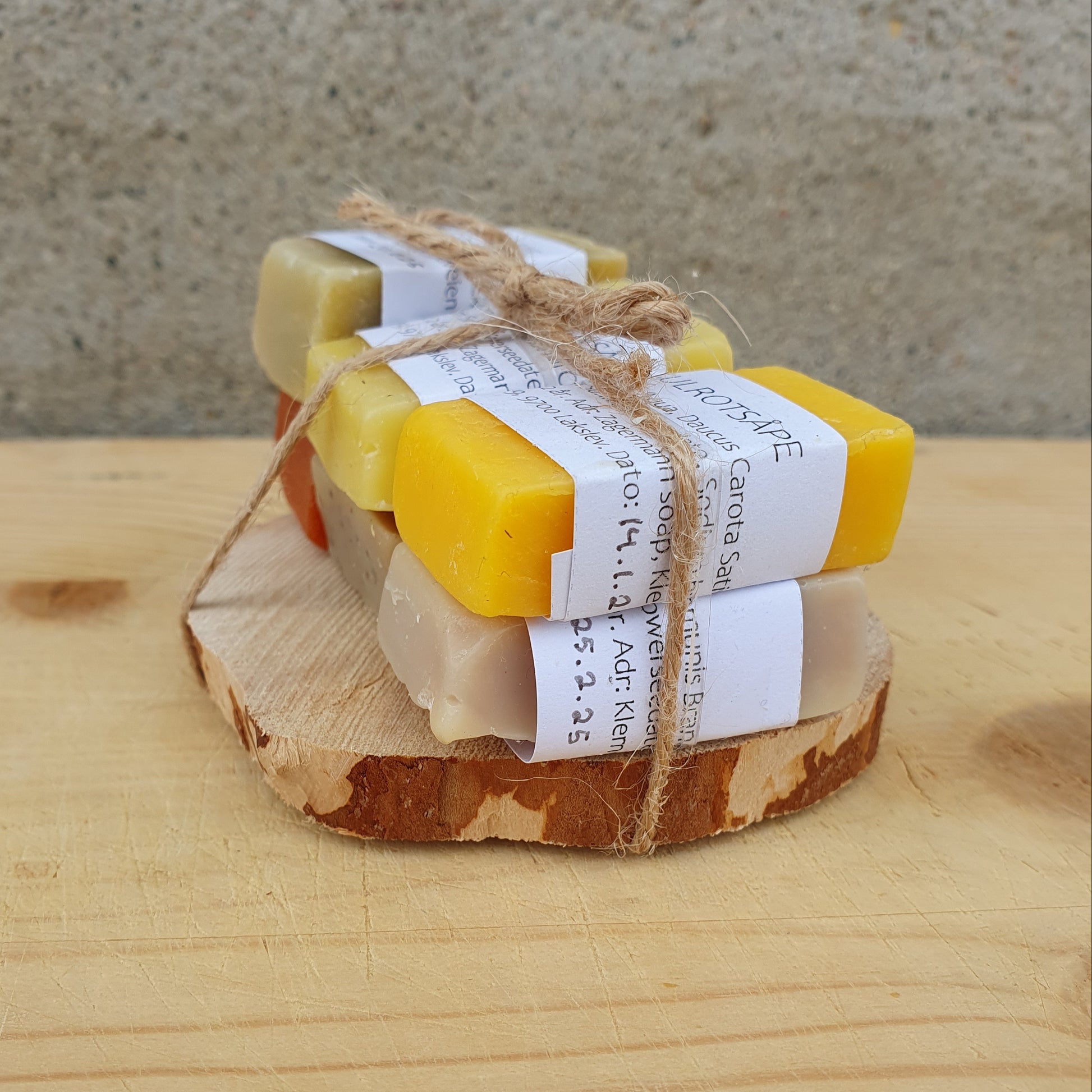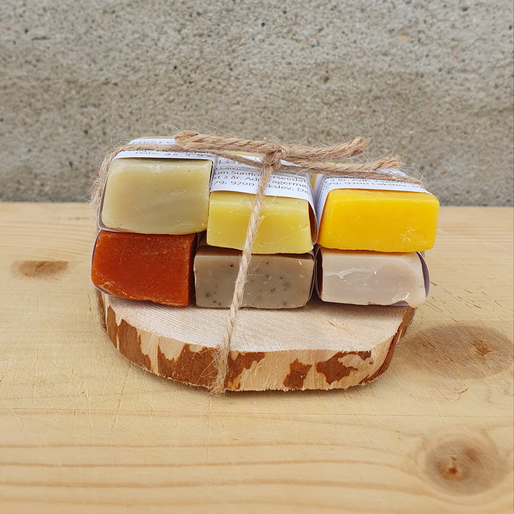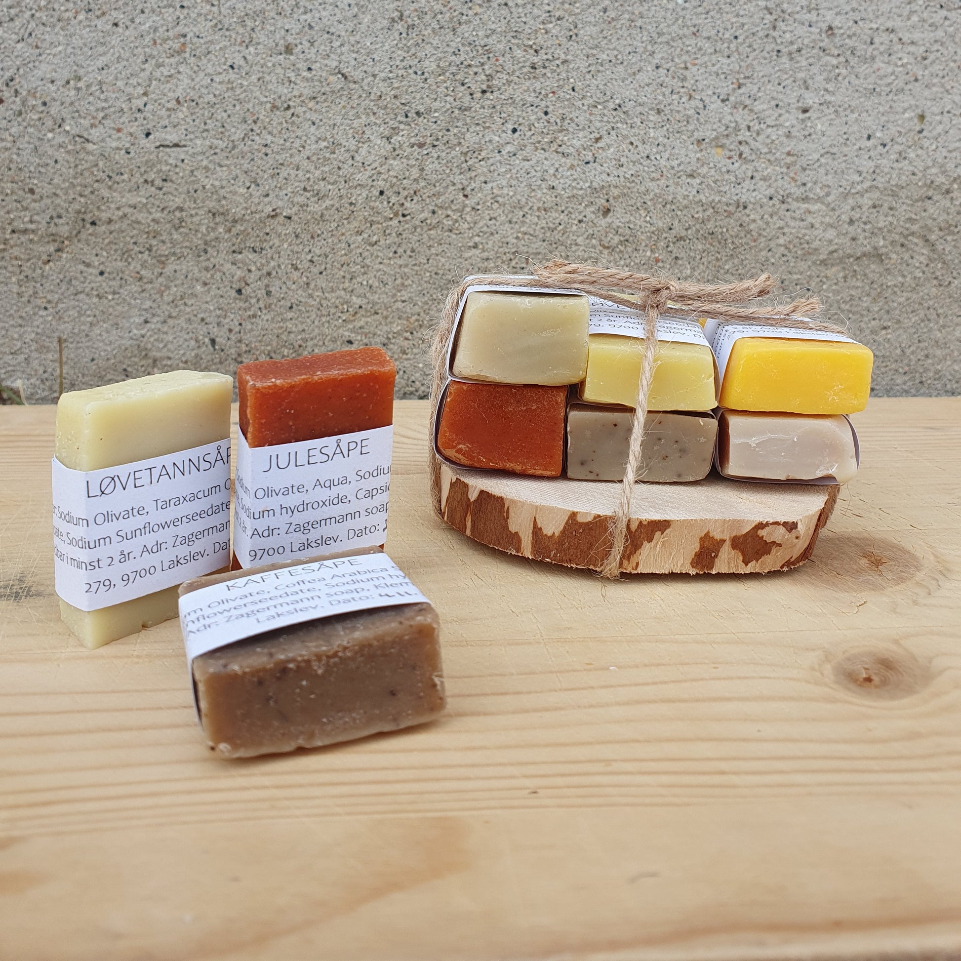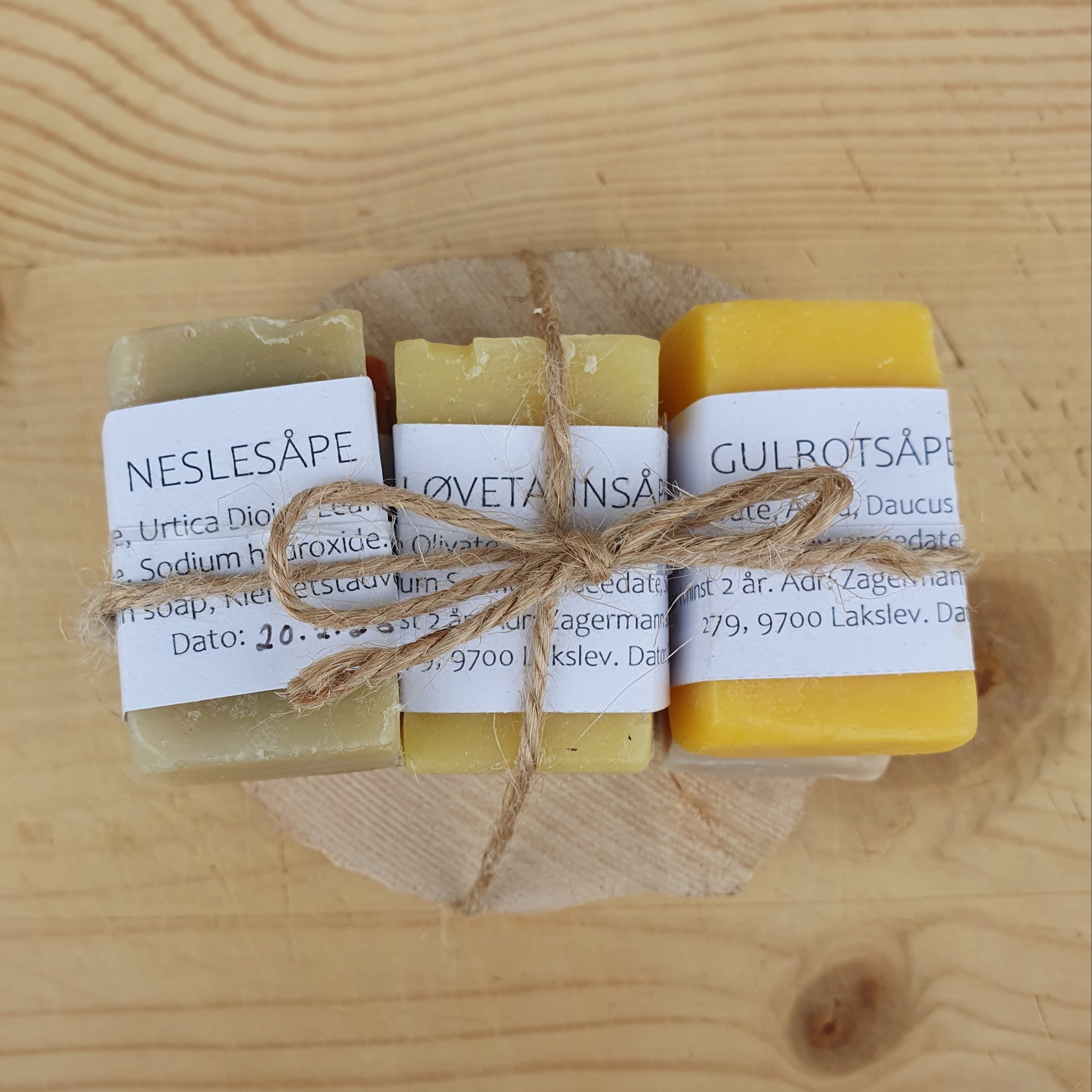 Er du usikker på hvilken såpe du tror passer for deg? Eller ønsker du å gi såpe i gave til en venn? Da kan vi anbefale deg å kjøpe en pakke med testsåper. Pakken inneholder et lite stykke av hver type hånd- og kroppssåpe vi selger, neslesåpe, løvetannsåpe, kaffesåpe, einersåpe, jule/hjertesåpe og gulrotsåpe. Hvert av de 6 stykkene veier ca. 15 g. Såpene leveres på en brikke av Finnmarks-bjørk med hamptau rundt.